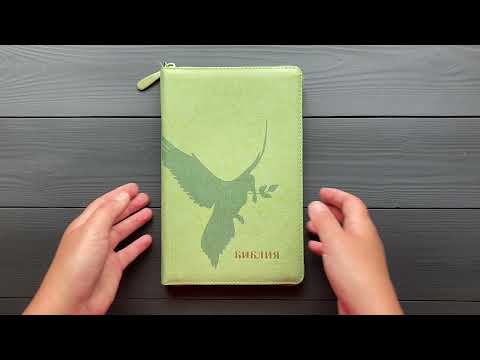 Библия (14,3х22 см, натуральная кожа, светло-салатовый, дизайн "голубь", надпись "Библия", молния, золотой обрез, 2 закладки, слова Иисуса выделены жирным, крупный шрифт)